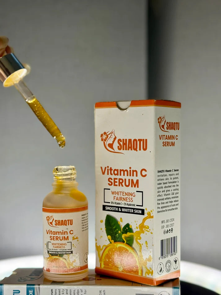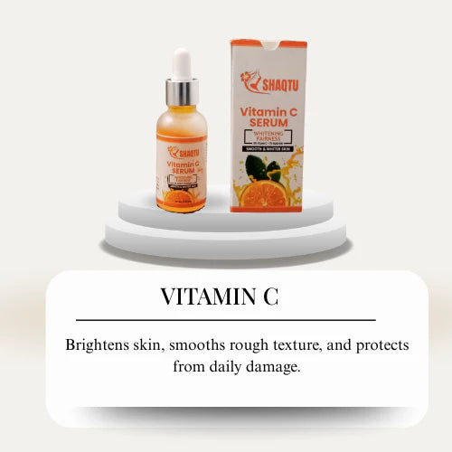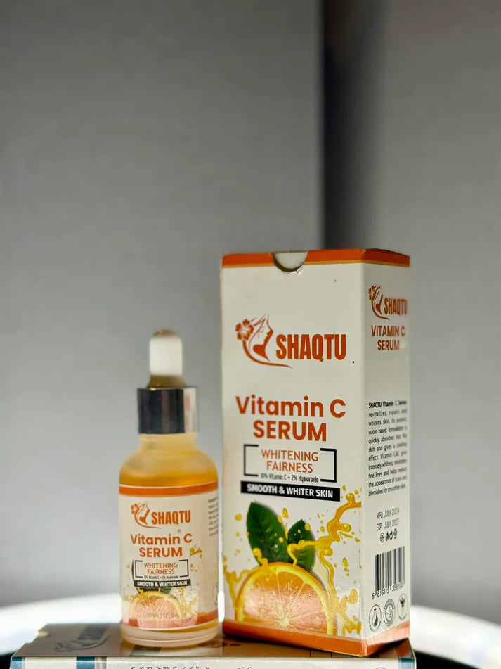 Unveil your skin’s natural radiance with Shaqtu’s advanced Vitamin C Serum — your daily dose of glow in a bottle. Powered by high-potency Vitamin C, this lightweight, fast-absorbing formula helps brighten dull skin, even out skin tone, and reduce the appearance of dark spots. Infused with hyaluronic acid for deep hydration and antioxidants to protect against environmental stressors, it works to leave your skin visibly smoother, firmer, and more luminous.